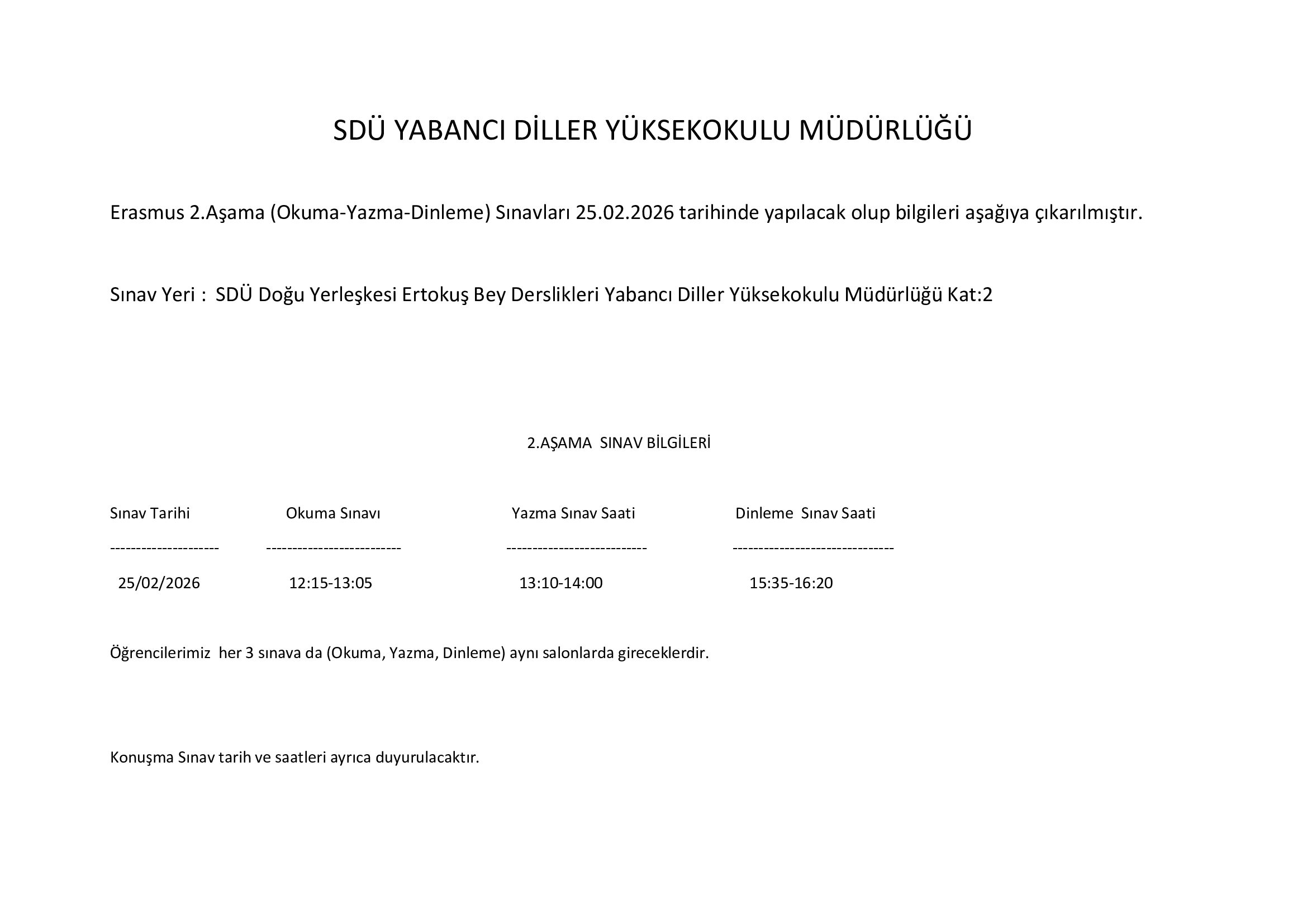 2. Aşama (Okuma–Yazma–Dinleme) sınavına girecek öğrencilerin listesi ve sınav salon bilgileri için TIKLAYINIZ.